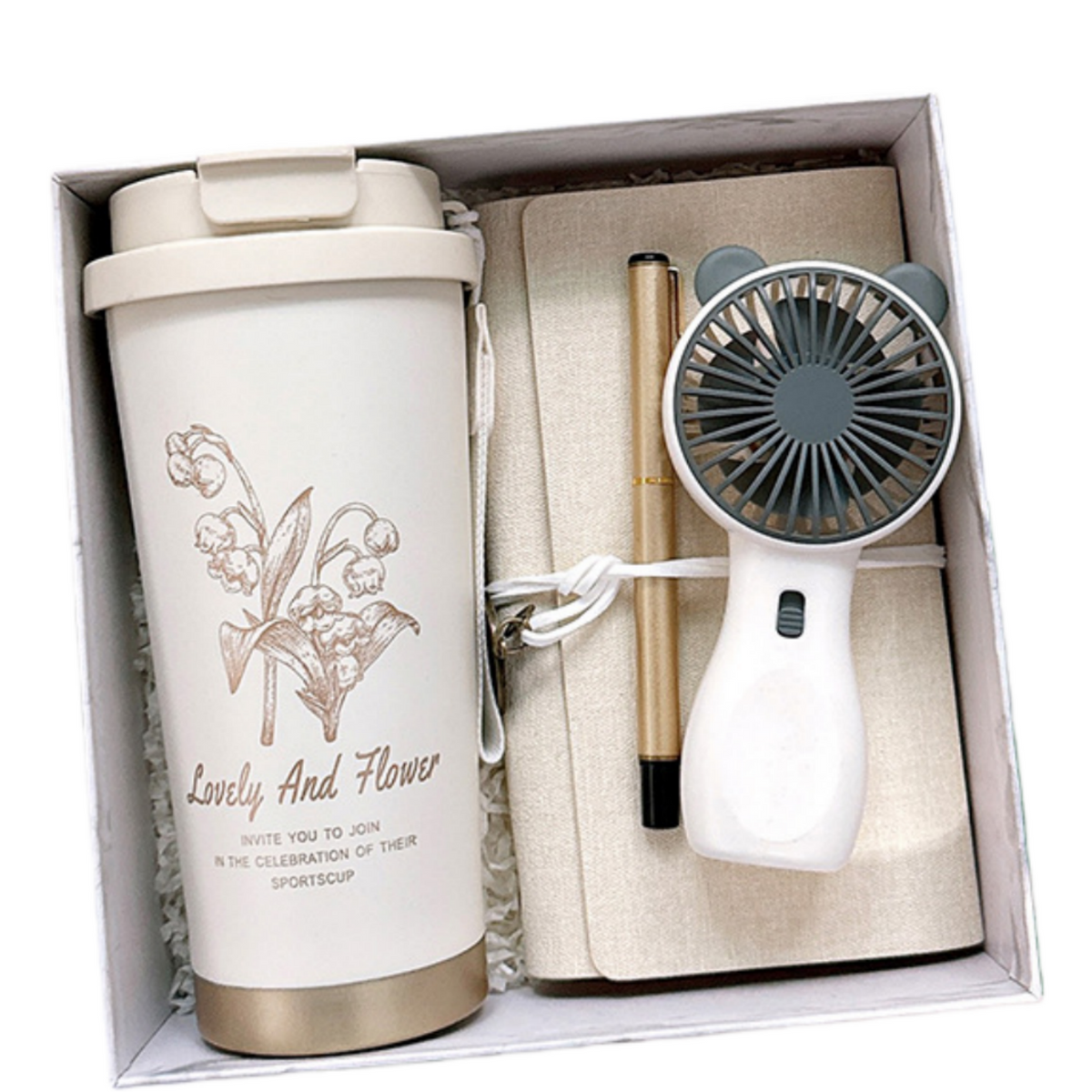 This specially designed gift set can distinguish your gift from other ordinary ones, making it appear luxurious and unique. Includes a coffee cup, a pen, a notebook and a rechargeable fan.